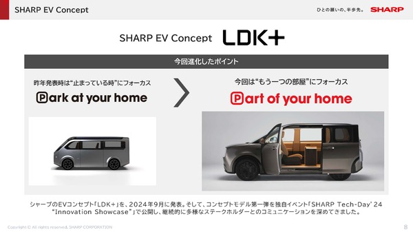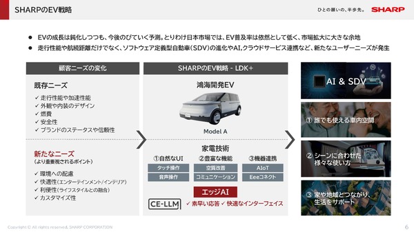 シャープは、前述の通りEVをAIデータソリューションと並ぶ中期戦略の柱と位置づけ、このLDK+を搭載したEVで2027年度に国内市場へ参入します。