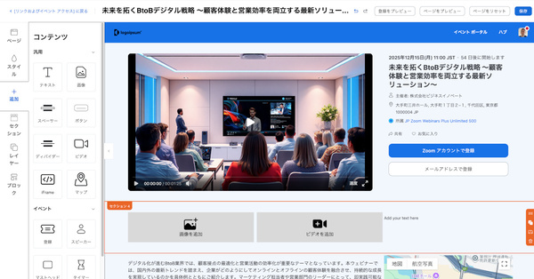 さらにEventsでは、参加者体験についても大規模イベントに近いものが提供できる。まず、「登録ページ」と呼ばれる参加希望者向けのランディングページを用意することができる。この登録ページは、あらかじめ用意されたパーツをドラッグ&ドロップするだけで、ノーコードで作成できる。運営担当者自身で簡単に作成/修正ができるので、制作を外注する必要がなく、時間もコストも抑えられる。