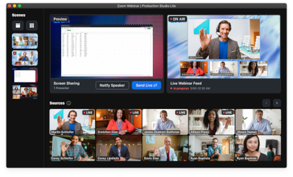 ウェビナー配信画面をデザインできる「プロダクションスタジオ」も用意されている。複数のカメラ映像やスライド映像を自由に配置した複数のレイアウトを準備しておき、配信中にリアルタイムで切り替える機能だ。ウェビナー中に単調な画面が続くと、退出者も増えがちであり、画面の切り替えは大切だ。