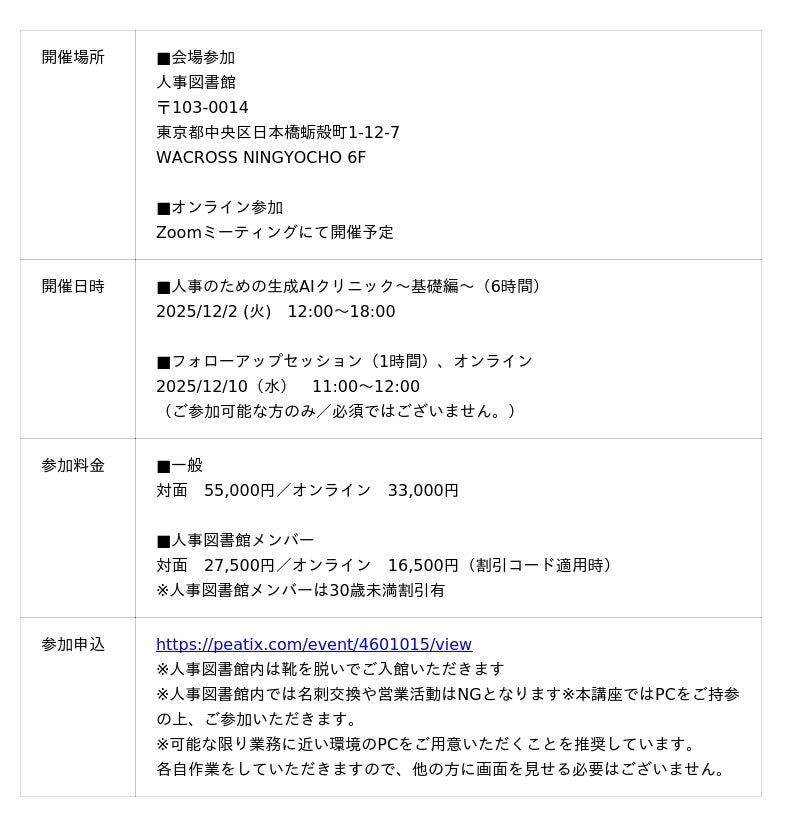 【人事向け実践講座】生成AIを使いこなし「戦略人事」への第一歩!基礎からワークで学ぶ『人事のための生成AIクリニック~基礎編~』12月2日(火)人事図書館にて開催|東京 人形町