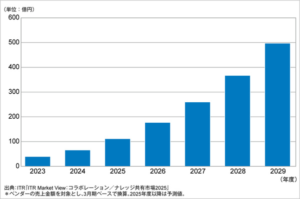 アプリケーションの操作手順を示すなどの機能を提供し、アプリ導入後の定着化をうながすデジタルアダプションプラットフォーム(DAP)国内市場についての予測。2024年度の売上金額は65億9000万円で、前年度比66.0%増の大きな成長を記録した。2025年度も成長の勢いを維持しており、69.8%増の予測。また、2024~2029年度の年平均成長率は49.9%で、2029年度には500億円市場に迫ると予測されている。用途としては、企業内におけるシステム操作教育の効率化やコスト削減が中心だが、顧客向けサービスへの適用も注目されている。