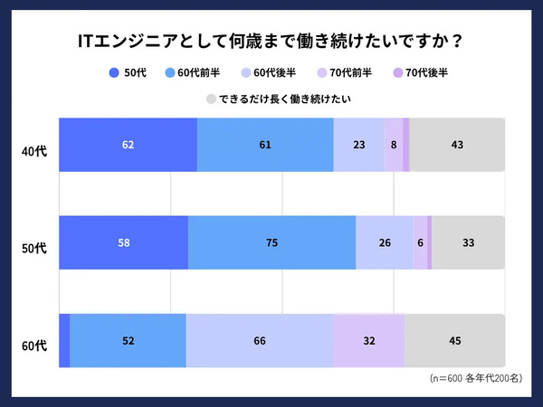 40~60代のITエンジニア600人を対象に「何歳まで働きたいか」と「AIスキルに対する意識」を聞いた。就労については、40代の3割が「50代までに早期リタイア」を希望している一方、60代では約7割が「60代後半」「70代前半」「できるだけ長く」働き続けたいと回答した。就労理由については全年代で「経済的に必要」が最多で、特に50代の回答比率が高かった。AIについて40代の18.5%、60代でも9.0%が「必須ツール」とした一方で、「使う場面がない」という回答も40代の25.5%、50代の31.5%、60代の39.5%で見られた。