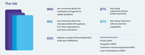 米国とヨーロッパの10カ国で、クレジットカードや決済処理を扱う企業の経営幹部(副社長レベル以上)/意思決定者600人を対象に、AI活用について調査した。調査対象企業の99%が「決済業務でAIを活用」している一方、回答者の91%が「リスクを懸念」していると答えた。特に「エージェント型AIデジタルアシスタントの影響を懸念」とした回答者は99%。また「正式なAIポリシーを持たずに運用を行なっている」企業が約半数(49%)に達しており、ガバナンス面でも課題が浮き彫りに。イノベーションを加速させる「クラウドネイティブな基盤を整備している」企業は20%にとどまった。