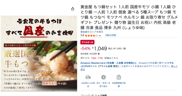 Amazonタイムセールで、人気の黄金屋「もつ鍋セット 1人前」しょうゆ味が54%OFFの1,049円と破格の値下げ中!