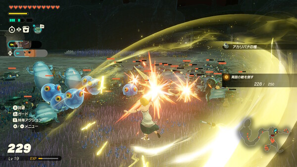なおアクション操作はシンプル。Yボタンが通常攻撃、Xボタンが強攻撃で、例えばYYYXで範囲攻撃を放てるのは「無双」シリーズおなじみだ。組み合わせでさまざまな攻撃に派生するので、使いやすい攻撃を自分なりに見つけだそう。
