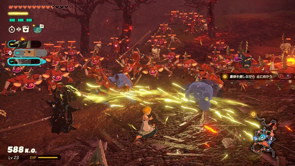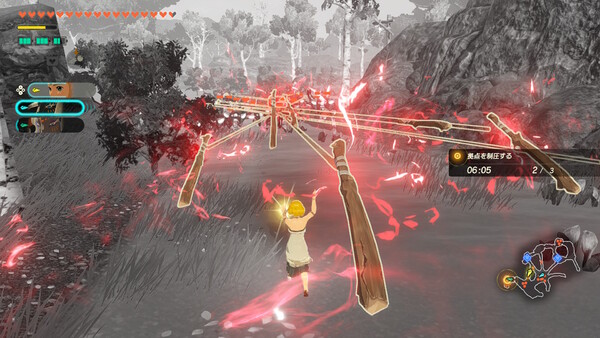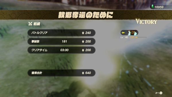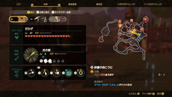 メインバトルのほか、領域を解放するバトルや仲間を救い出す【バトルチャレンジ】、アイテムを収めて各キャラのアクションやハートを増やす【ハイラルチャレンジ】もあり、ボリュームはかなりのもの。短いバトルは3分程度で終わるし、長いバトルなら20分くらい戦い続けることも。