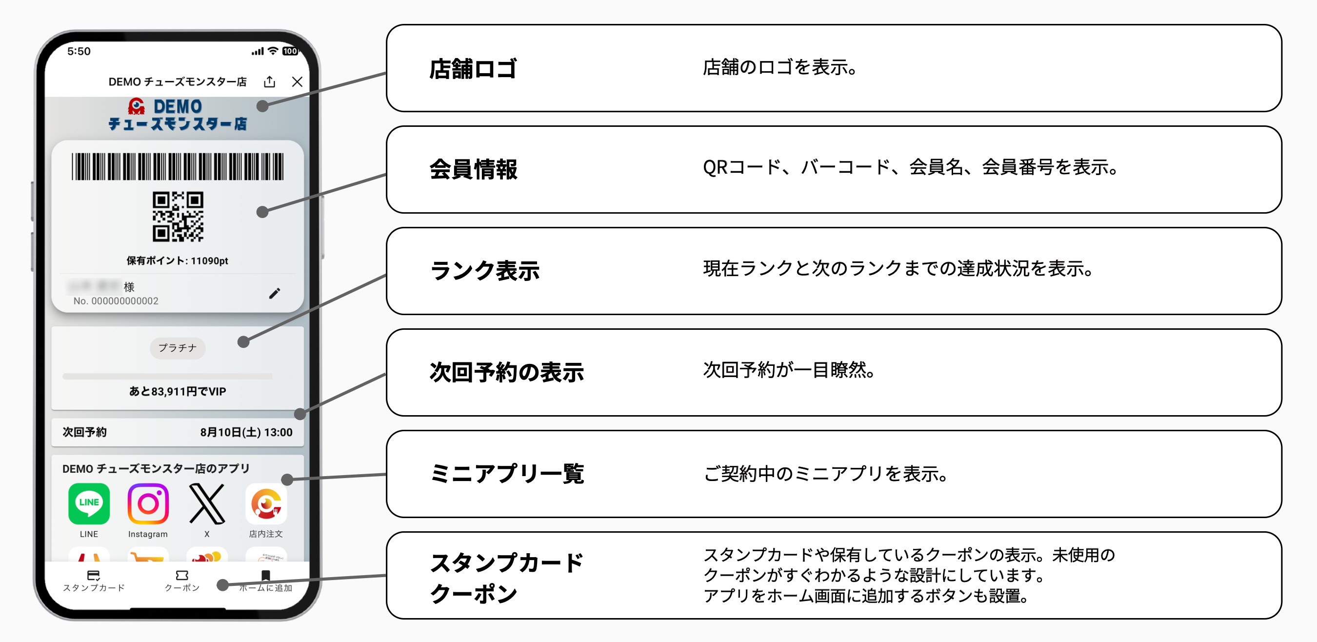 「LINEミニアプリ」は、店舗・企業が「LINE」上で自社サービスを提供できる新しいアプリプラットフォームです。会員証やモバイルオーダー、予約受付などのサービスをアプリの追加ダウンロード・会員登録不要で「LINE」上で提供でき、重要なお知らせを無料で通知することが可能です。