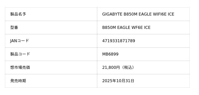 製品詳細 https://newx-corp.jp/product/gigabyte-b850m-eagle-wifi6-ice/