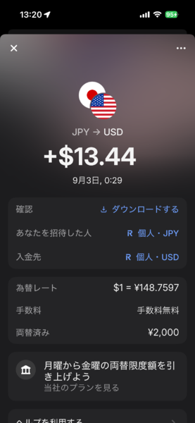 Wiseは両替する通貨によってもかわりますが、1回で0.6%ほどの手数料とかなり低めの設定。そのため、使い方によっては高い海外事務手数料が必要なクレジットカードよりも、最終的な支払いを抑えることができるわけです。