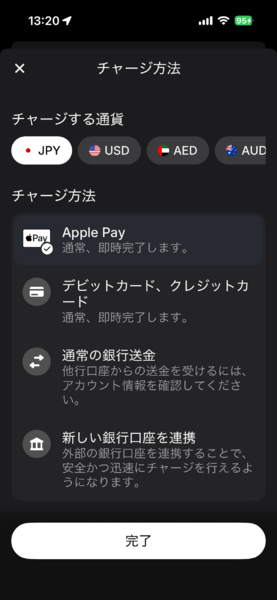 また日本円をチャージする場合は、クレジットカードやデビットカード、もしくは銀行口座からの振込で行えます。その際にクレジットカードやデビットカードの場合はブランドによっては手数料(だいたい1.7%から3%強)がかかるので、銀行振込のほうがオトク。振込手数料が無料の銀行口座を使えば、より節約できます。