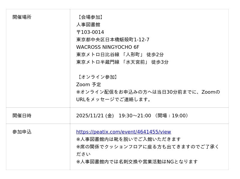 2024年4月1日に東京人形町にオープンした、人事関連職が集まるコワーキング×コミュニティ。2500冊以上の人事に関する書籍と700名以上の会員を有しており「仲間と学びで、未来を拓く」をタグラインに運営しています。