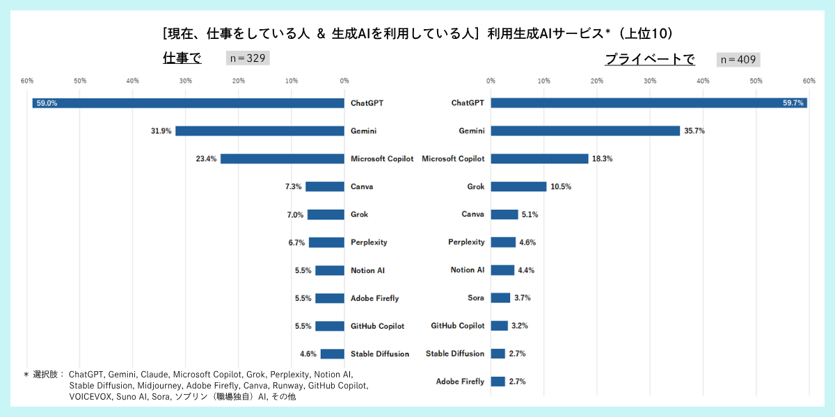 【プライベート】の方も、「ChatGPT(59.7%)」が最も高く、「Gemini(35.7%)」、「Microsoft Copilot(18.3%)」が続き、上位3位までは同順位となっている。