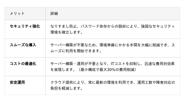 今回の新サービスでは、従来オンプレミスで必要だった認証サーバーの構築・運用の負担をなくし、「実績ある確かな認証技術」をより手軽に、かつ安全なクラウドサービスとして導入できるようになります。