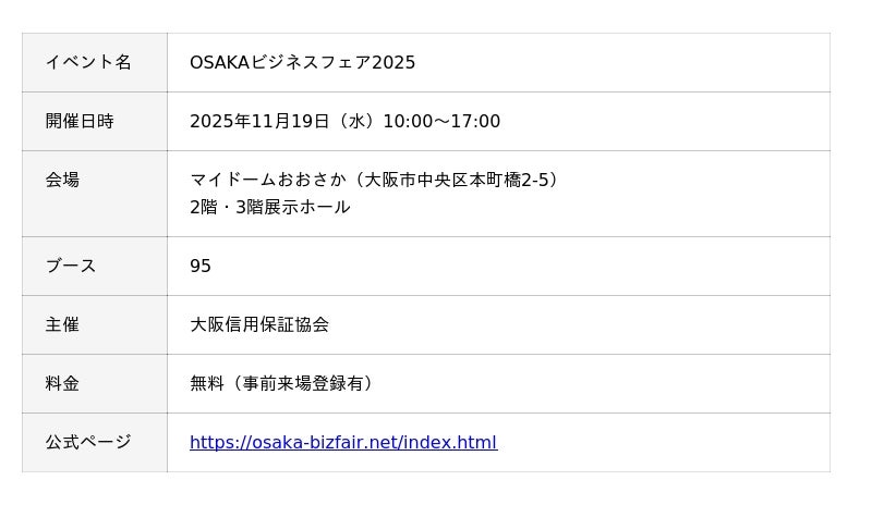 APPLE TREE株式会社(所在地:大阪府大阪市、代表取締役社長:朴 秀明)は2025年11月19日(水)にマイドームおおさか(大阪市中央区)で開催される「OSAKAビジネスフェア2025」に出展いたします。