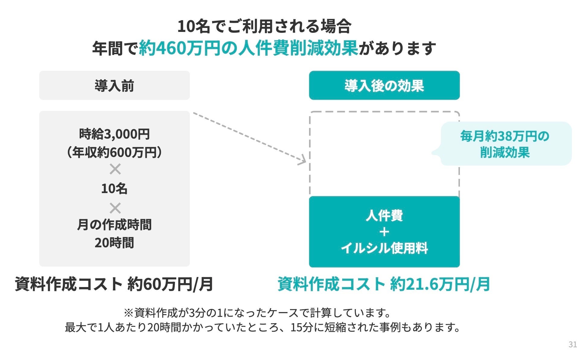 従業員100名規模の企業で、「イルシル」導入により1人あたり1日15分の資料作成時間を削減。月20営業日で全社500時間の削減、年間換算で数百万円規模の人件費削減に直結。