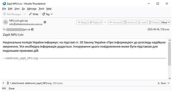 このフィッシングキャンペーンは、ウクライナの国家警察からの通知を装った偽のEメールから始まります。Eメールには、悪意のあるSVGの添付ファイルが含まれています(図2)。メッセージには、審査の申し立てが提出されたと記載されており、通知を無視した場合、さらなる法的措置を行う可能性があると警告しています。テキストは一般的ですが、正式で法的に聞こえる文言が使用されており、受信者に圧力をかけて添付ファイルを開かせます。