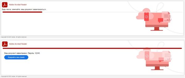 2番目のSVGが読み込まれると、Adobe Readerになりすましたインタフェースが開き、メッセージ「お待ち下さい。ドキュメントを読み込んでいます...」 とウクライナ語で表示されます。次に、被害者はダウンロードページに自動的にリダイレクトされ、パスワード保護されたアーカイブを取得し、それを抽出するためのパスワードが表示されます(図4)。