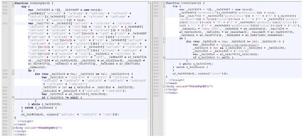 HTAファイルの関数は標準的なWebページと非常に似ていますが、ActiveXコントロールにアクセスする機能も備えています。このケースでは、コードは、その目的を隠蔽するために、文字列エンコーディングと配列シャッフルを使用して意図的に難読化されます(図6)。