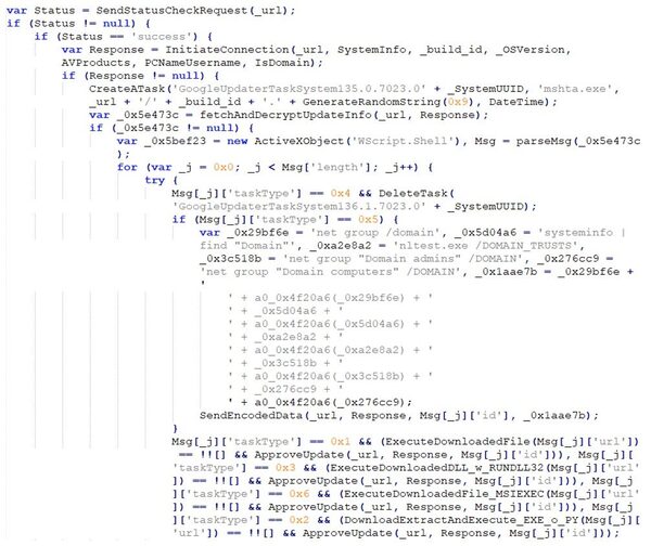 スクリプトの主な役割は、リモートサーバーとの接続を確立し、ペイロードの次の段階を待つことです。接続が確立されると、マルウェアは被害者のシステムから情報を収集し、XorBase64エンコーディングを使用して難読化した後、HTTP POSTリクエストで送信します。その後、ローダーは、エンコードされたgetUpdatesメッセージを送信し、サーバーから追加のコマンドを取得します(図7)。
