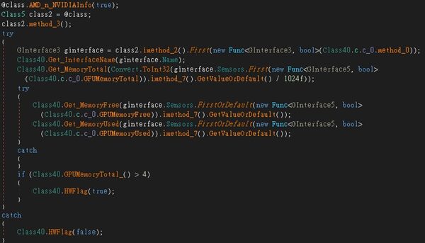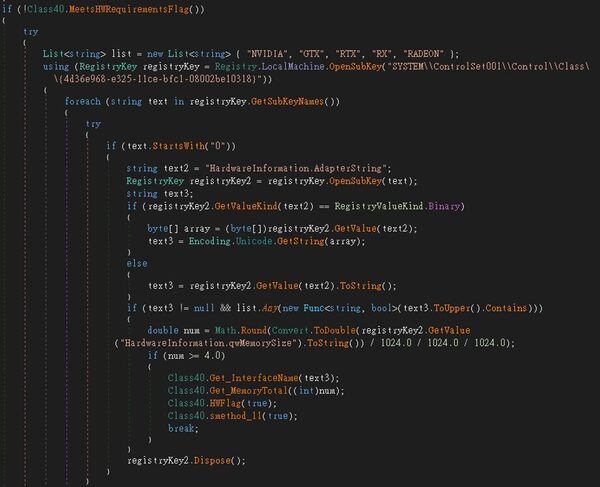 PureMinerはハードウェア仕様を収集するために、AMD Display Library(atiadlxx.dll / atiadlxy.dll)とNVIDIAライブラリ(nvapi.dll / nvapi64.dll)のAPIを使用します。これらのAPIは、合計メモリ、利用可能なメモリ、および現在使用中のメモリに関する詳細を返します(図11)。また、システムレジストリから直接、ビデオアダプタ情報をクエリします(図12)。マイニングを開始する前に、同マルウェアは、対象システムのメモリが少なくとも4 GBあることを確認します。
