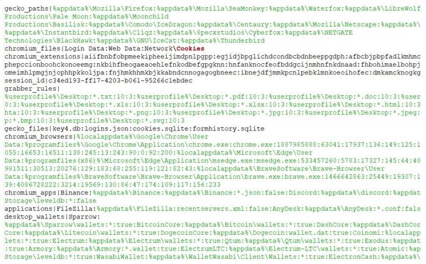 Chromiumベースのアプリケーションの場合、このマルウェアは構成パラメータのchromium_browsers、chromium_files、chromium_extensions、およびchromium_appsを利用します。これらの値を使用して、ターゲットのブラウザやアプリケーションを指定し、ディレクトリパスを識別し、ブラウザ拡張機能データを検索し、収集するファイルを定義します。