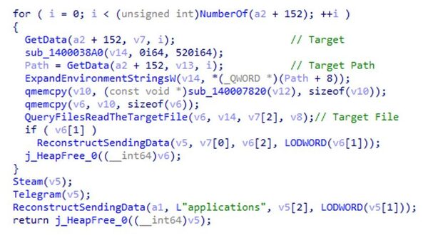 Amatera Stealerは、構成ファイルにリストされているアプリケーションに加えて、ハードコードされた2つのルーチンが含まれており、SteamおよびTelegramからデータを抽出します(図20)。