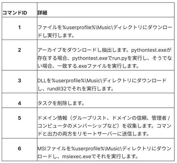 このローダーは6つのコマンドをサポートしており、複数の形式でペイロードをダウンロードして実行し、ドメインの偵察を実施し、活動の痕跡を削除することができます。