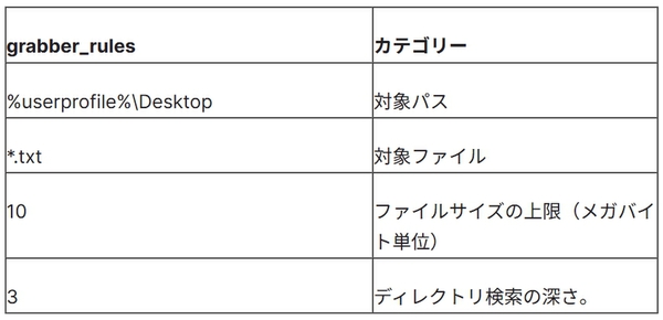 ファイルグラバーモジュールは、構成で定義されているgrabber_rulesに従ってファイルを収集します。各ルールは以下の4つの要素で構成されています。