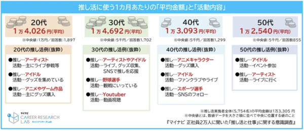 調査では、推し活に使う月平均金額についても調べている。30代が1万4692円で最多。20代(1万4026円)、40代(1万3093円)、50代(1万2540円)と続き、1万円以上の消費が一般的な様子だ。