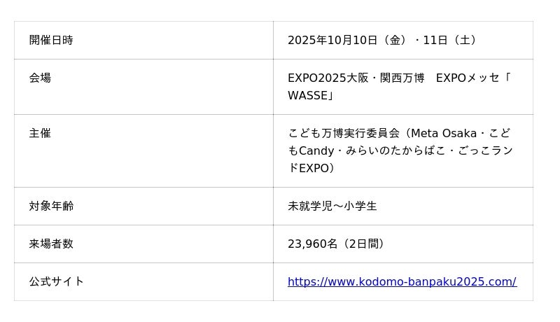 ※「未来のトビラをひらく『こども万博』」は株式会社Meta Osaka(こどもCandy)、株式会社ママそら(みらいのたからばこ)、株式会社キッズスター(ごっこらんどEXPO)の3社による共創プロジェクトとして開催。