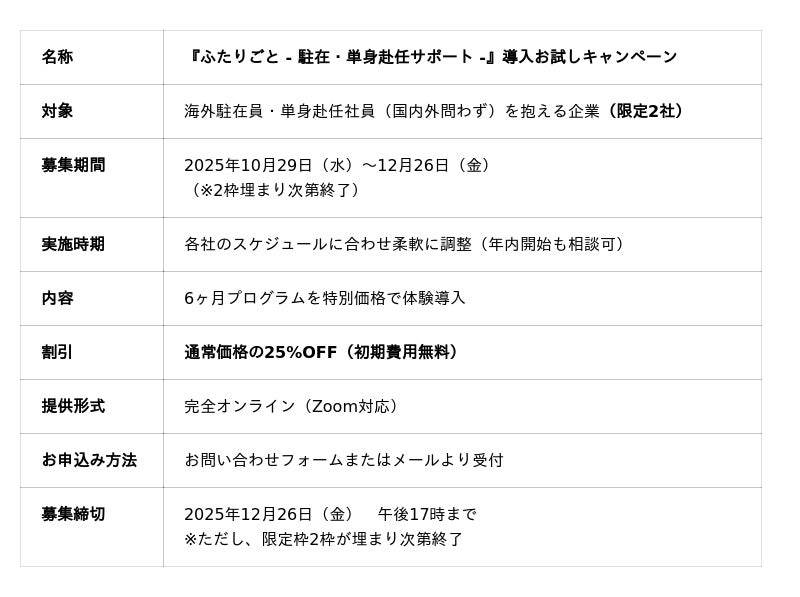 株式会社Oden(本社:東京都渋谷区、代表取締役:会川智華)は、海外駐在員・国内単身赴任者とそのご家族を対象に、オンラインの1on1と家族チームコーチングで孤独・不安を軽減し、本人の業務パフォーマンス向上・家族の安心・離職/早期帰任リスク低減を同時に支援する福利厚生プログラム〈ふたりごと〉の期間限定お試しキャンペーン(募集期間:2025年10月29日~12月26日/2社限定)を実施します。