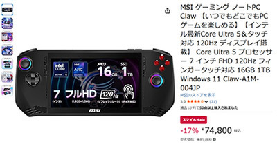 【残りわずか】Core Ultra 5搭載! MSIのポータブルゲーミングPC「Claw」が74,800円のセール特価