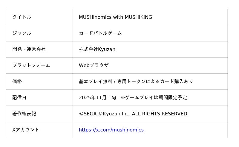 本ゲームは、MUSHIを使用した期間限定ゲームとして、リリース後、約6週間のイベント開催を予定しています。『甲虫王者ムシキング』のファンだけでなくWeb3ゲームのユーザーに楽しんでもらう事を目指しています。