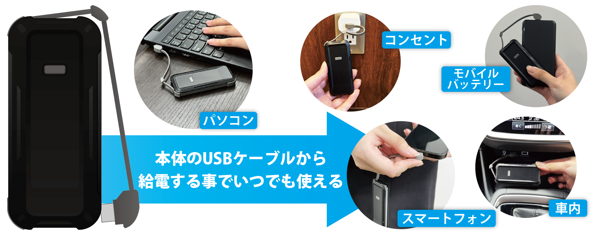 本端末はUSB Type-Cケーブルが内蔵されており、パソコンや電源アダプタ、モバイルバッテリーやスマートフォン、車内のUSBソケットなどへ接続することで、電源が入り、Wi-Fi通信を利用することができ、バッテリー切れにより使えなくなるなどがなく、給電し続ける限り長期間利用が可能です。