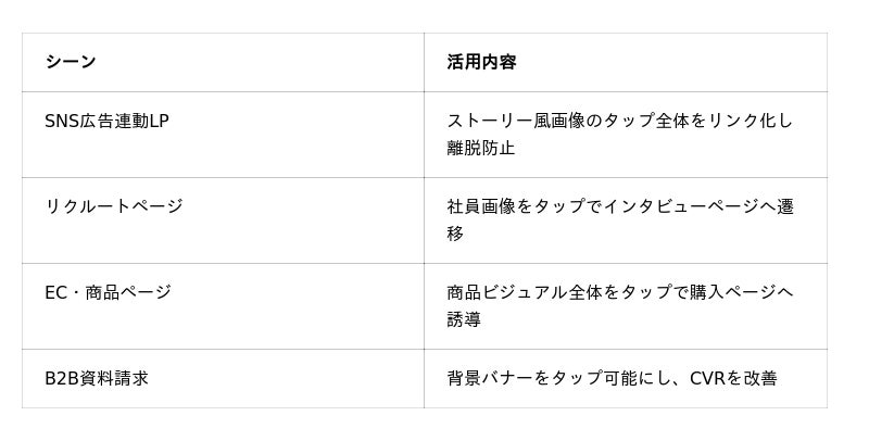 本機能により、ページ上の任意範囲をタップ可能エリアとして設定でき、スマートフォン閲覧時のUX向上とCVR(コンバージョン率)最適化に寄与します。