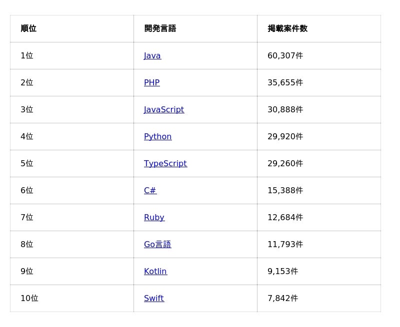 AI分野やデータ解析で人気のPythonは4位(29,920件)、Web開発で注目のTypeScriptは5位(29,260件)と、上位はいずれも需要の高い言語です。