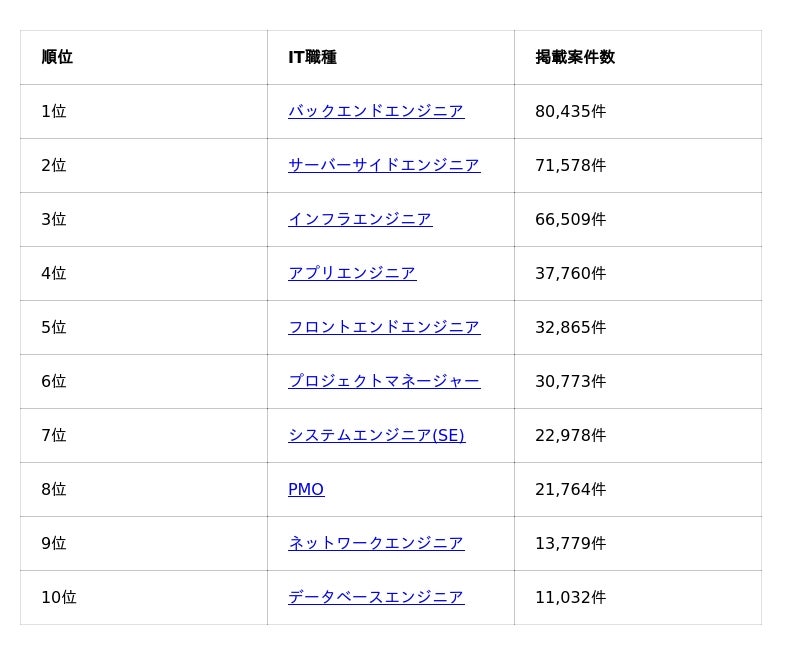 IT職種別の掲載案件数は1位がバックエンドエンジニア(80,435件)、2位がサーバーサイドエンジニア(71,578件)、3位がインフラエンジニア(66,509件)となっています。