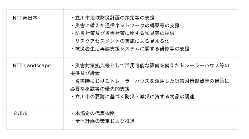 NTT東日本株式会社 東京西支店(支店長:伊藤 弘造、以下「NTT東日本」)、株式会社NTT Landscape(代表取締役社長:木下 健二郎、以下「NTT Landscape」)は、立川市(市長:酒井 大史)と、「防災対策及び災害対応への協力に関する協定」を締結いたしました。