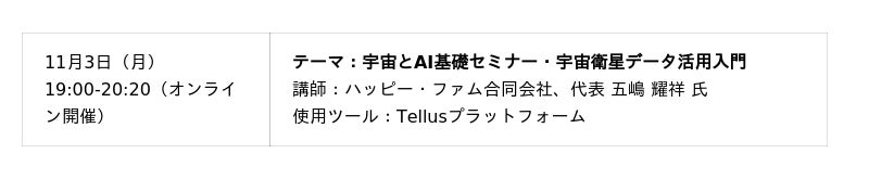株式会社Meta Heroes(本社所在地:大阪府大阪市、代表取締役:松石和俊、以下「当社」)は、当社が運営する生成AIコミュニティ「AI MONDAY」の2025年11月3日の開催スケジュールを公開しました。11月3日は、ハッピー・ファム合同会社、代表 五嶋 耀祥 氏による「宇宙とAI基礎セミナー・宇宙衛星データ活用入門」になります。