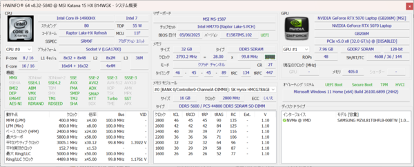 「Katana 15 HX B14Wシリーズ」は、15.6インチのWQHD(2560×1440ドット)の液晶ディスプレーを採用したモデルで、CPUにインテル Core i9 14900HXプロセッサー(8P+16E/24コア/32スレッド)、もしくはインテル Core i7 14650HXプロセッサー(8P+8E/16コア/24スレッド)を搭載。GPUにNVIDIA GeForce RTX 5070 Laptop GPU 8GB GDDR7、もしくはNVIDIA GeForce RTX 5060 Laptop GPU 8GB GDDR7を組み合わせた、4モデル構成の中から選択するようになっている。