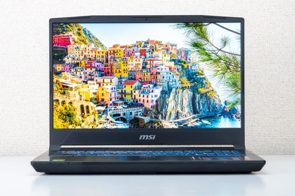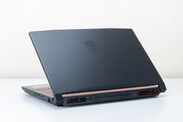 天板には、MSIのエンブレムが刻印されており、ブラックで引き締まった筐体は、ゲーミングノートPCらしい仕上がりだ。キーボードは4ゾーンRGBバックライトを内蔵しており、設定により色や光り方をコントロール可能。1.7mmのキーストロークが確保されているので、しっかりした打鍵感があり、WASDキートップのみスケルトン仕様になっているなど、ゲームプレイの気分を高めてくれる。