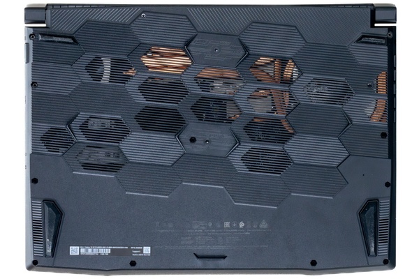 底面を見ると、銅色に輝くヒートパイプが確認でき、「Cooler Boost 5」と呼ばれる冷却設計は、2基の冷却ファンと5本のヒートパイプによりCPUとGPUの温度上昇を抑える。