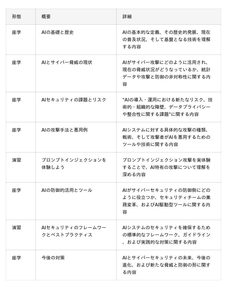 本プログラムは、AIの基礎理解からAIを悪用した攻撃の実例、さらに防御のための分析・演習までを体系的に学べる構成です。理論だけでなく「体験を通じた理解」を重視し、プロンプトインジェクションの実演やMITREフレームワークを用いたAI脅威分析演習など、実務に直結する内容を盛り込みました。