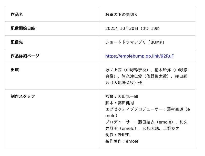 ショートドラマアプリ「BUMP」を運営するemole株式会社(本社:東京都目黒区、代表取締役:澤村直道、以下emole)は、BUMPオリジナルショートドラマ『教卓の下の裏切り』を2025年10月30日(水)19時よりBUMP独占配信いたします。
