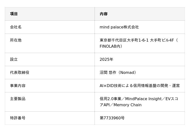 MindPalaceはこの加盟を通じて、DID(分散型ID)・ゼロ知識証明(ZKP)・信用スコアなど、Web3時代の新しい信用モデルの社会実装に向けて、業界・行政・研究機関との連携を深めてまいります。
