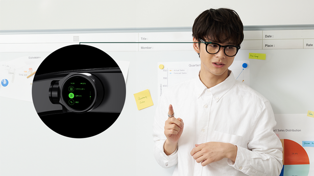 スピーチの要点を事前登録すれば、本番中に視界に表示。テンプルをタッチするか、専用のリング型コントローラー※で操作することで、表示内容のページ送りが可能。さらに、お好みに合わせて、スクロール速度(6段階)と文字サイズ(3段階)も細かく調節できます。原稿確認の手間や不安が軽減され、常に自信を持ってプレゼンを進められます。