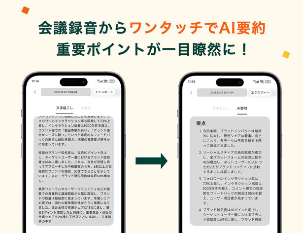 アプリでワンタップするだけで文字起こしが完了し、AIが議事録を自動作成。議題の本質を素早く把握し、迅速な意思決定をサポートします。