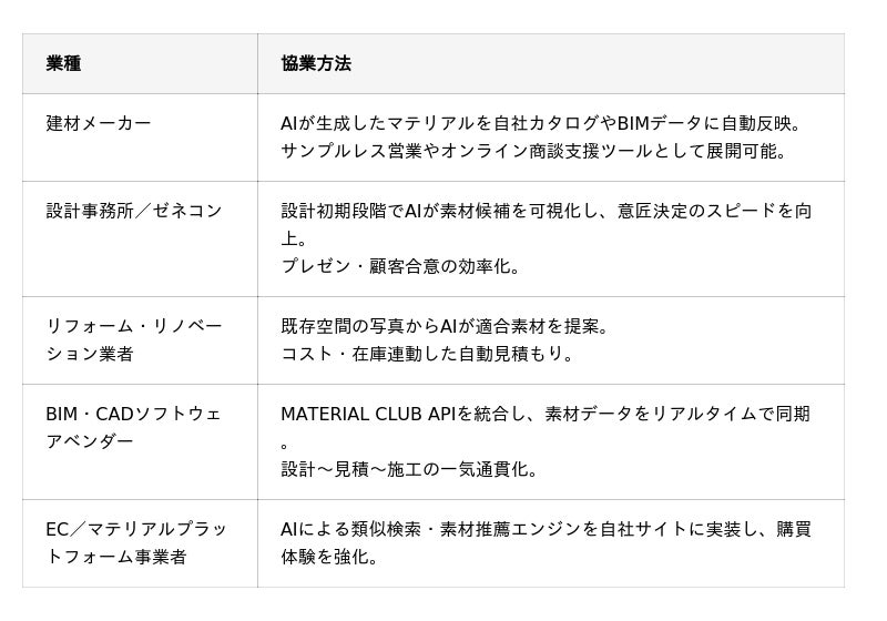AIによる素材生成や空間シミュレーションを、建材メーカー・設計ソフト・施工支援ツールなど、各社の既存システムへ統合。