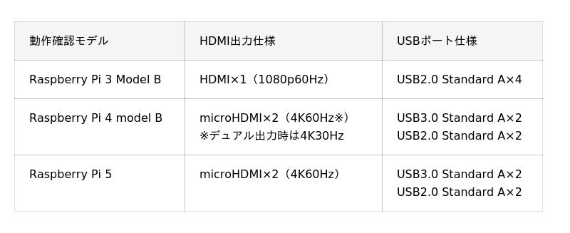 今回の動作確認では、Raspberry PiのHDMI出力・USBポートが「HDMIパソコン切替器のHDMI入力ソース・USBポート」として使用可能なことを確認しています。